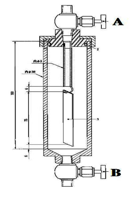 3 、用镊子夹住新磨光的铜片,立即挂到圆筒的挂钩上,并放入筒中(圆筒保持垂直)。在装配时保证铜片的底边距离筒底至少 6mm。仪器装配好后把 A 阀和 B 阀关上。